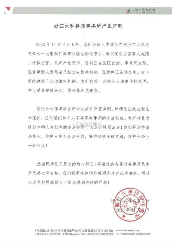 11月3日,女律师所在的浙江六和律师事务所发布严正声明称,省市两级律协已启动维权机制。该所在第一时间介入该事件的处理,并已妥善安排医疗、维权等相关事宜,并对该行为严厉谴责。