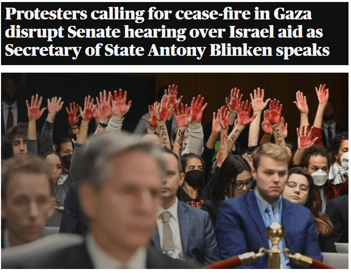 近日,在美国国会参议院拨款委员会的听证会现场,多名抗议者要求华盛顿停止继续军援以色列,呼吁在加沙地带实现停火。