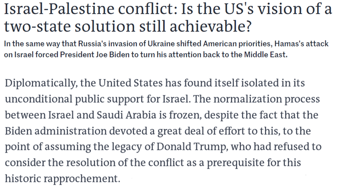 法国《世界报》也评论称,在外交上,美国因为无条件公开支持以色列而被孤立了。拜登政府曾处心积虑地推动以色列和沙特阿拉伯的关系正常化,但新一轮巴以冲突冻结了这一进程。
