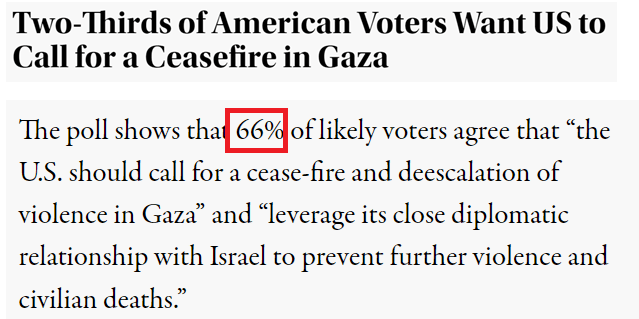 最新民调显示,约三分之二(66%)的美国选民认为,美国应该推动巴以停火。