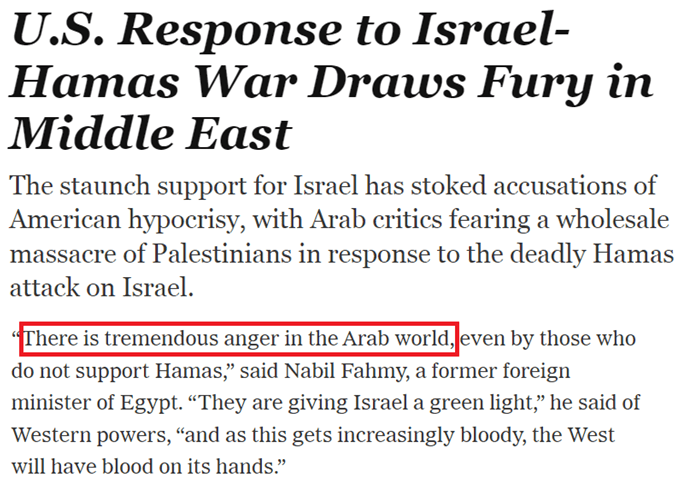 《纽约时报》就此发文称,美国对以色列的坚定支持引发了阿拉伯世界对华盛顿虚伪做派的指责。