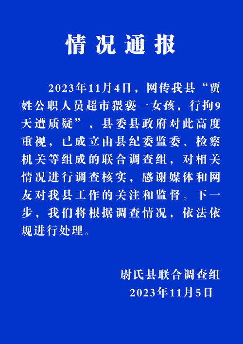 2023年11月4日,网传尉氏县“贾姓公职人员超市猥亵一女孩,行拘9天遭质疑”,县委县政府对此高度重视,已成立由县纪委监委、检察机关等组成的联合调查组,对相关情况进行调查核实,感谢媒体和网友对我县工作的关注和监督。下一步,我们将根据调查情况,依法依规进行处理。