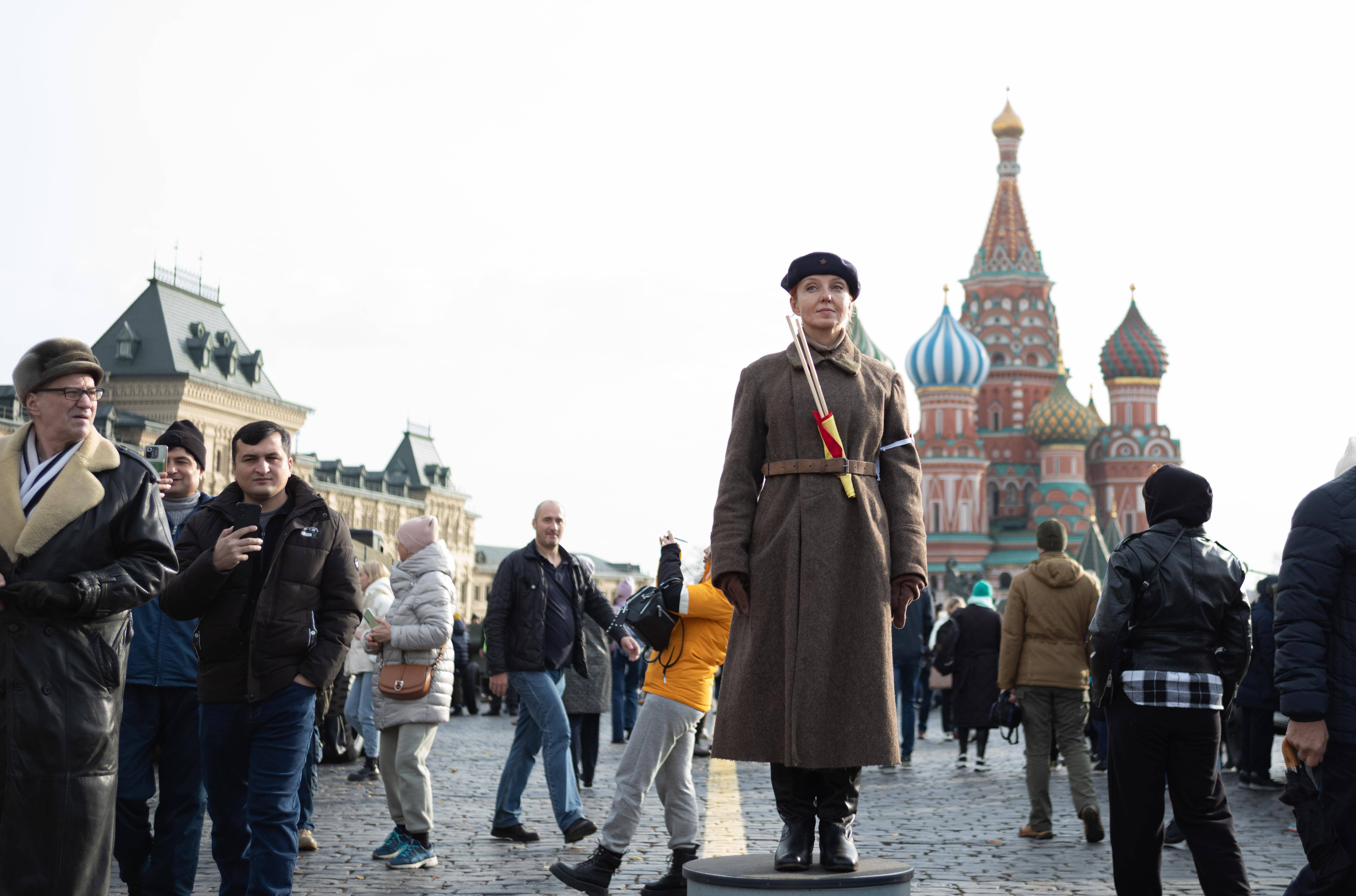 当日,俄罗斯在红场举行露天展览,纪念1941年苏联红场阅兵式。1941年11月7日举行的莫斯科红场阅兵式具有历史意义。当时,苏联正处于卫国战争最艰难阶段,纳粹德国军队兵临莫斯科城下。苏联士兵参加完红场大阅兵后,直接开赴几十公里外的莫斯科郊外与侵略者作战。