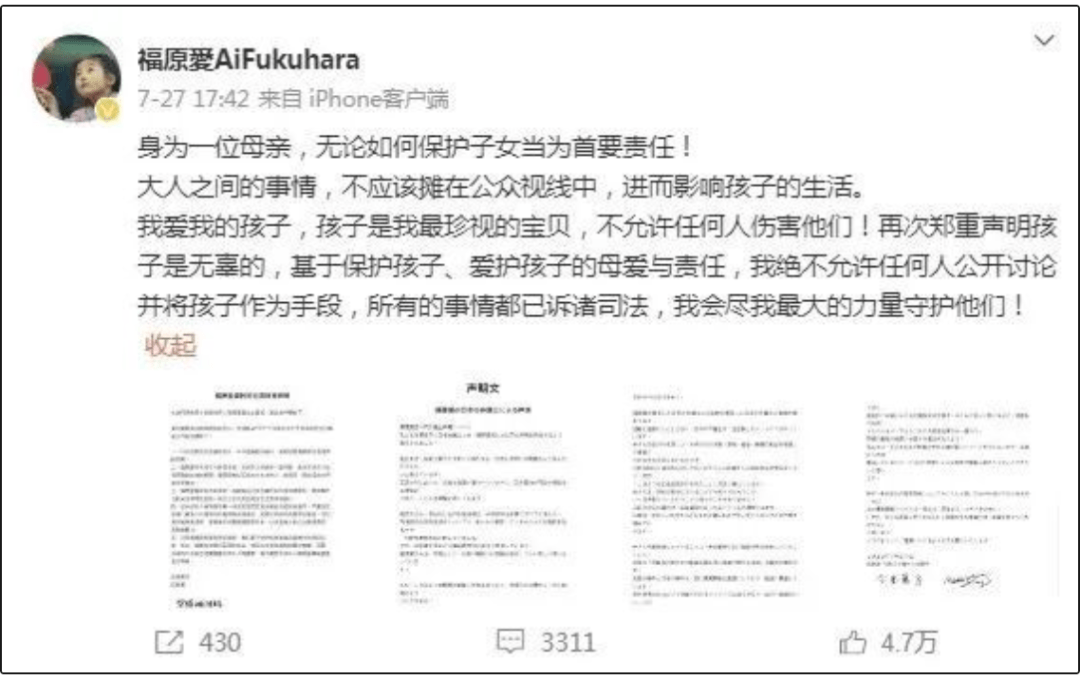 福原爱说,孩子是无辜的,基于保护孩子、爱护孩子的母爱与责任,“我绝不允许任何人公开讨论并将孩子作为手段,所有的事情都已诉诸司法,我会尽我最大的力量守护他们!”