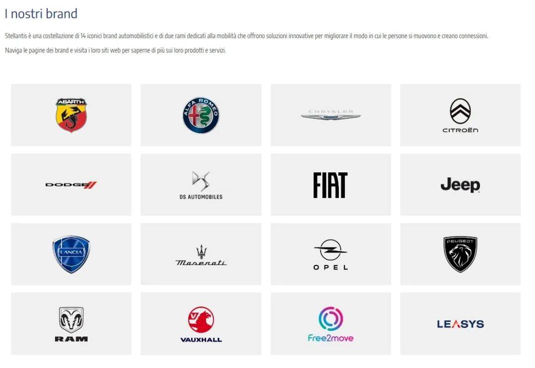Stellantis 集团旗下品牌包括阿巴斯、阿尔法・罗密欧、克莱斯勒、雪铁龙、道奇、DS、菲亚特、菲亚特商用车、Jeep、蓝旗亚、玛莎拉蒂、欧宝、标致、RAM、沃克斯豪尔,覆盖超豪华、豪华、主流乘用车乃至重型皮卡、SUV 和轻型商务车等细分市场。此外,还有专门的移动出行、金融、零部件及服务品牌。