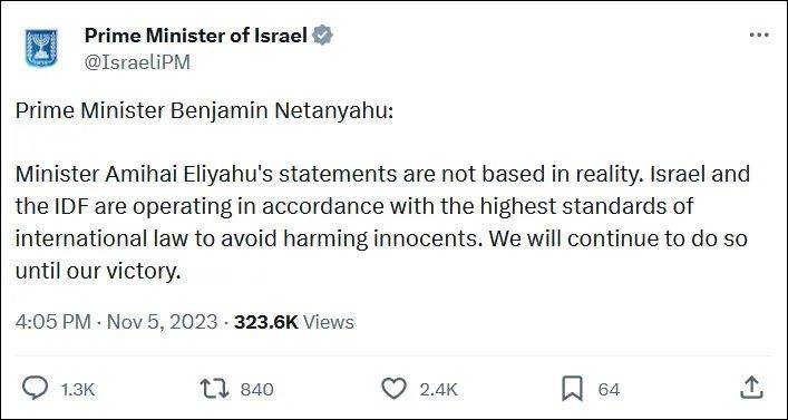 这些言论很快在网上受到严厉批评,并惊动了以色列总理。当地时间5日上午,内塔尼亚胡办公室发布声明驳斥了埃利亚胡有关“可能在加沙地带投掷核弹”的说法,并宣布无限期暂停埃利亚胡参加内阁会议的资格,直至另行通知。