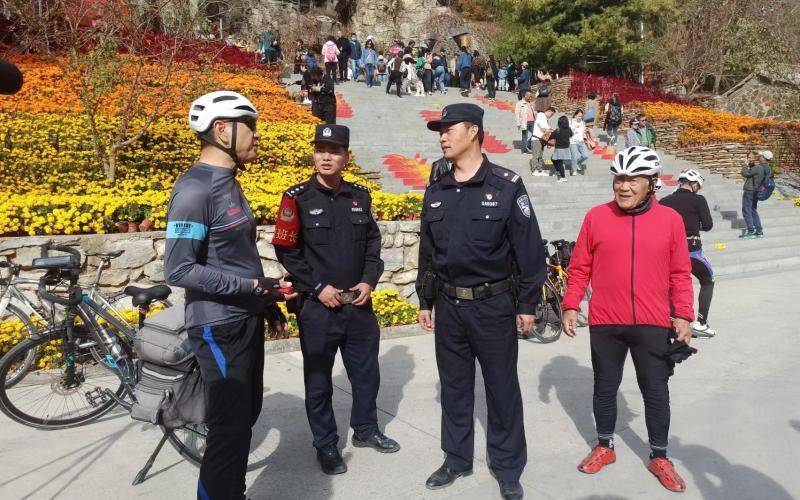 “请问坡峰岭是从这里上去吗?上去都有哪些游玩路线?”一位七十多岁的骑行者向正在执勤民警问路。听到老者是从天津骑车到北京游玩,民警谢辉龙热情地介绍起来。“这儿有秋风亭、云湖,你们来爬山千万注意安全,不要去野山。”看到有带孩子来游玩的,谢辉龙也主动上前叮嘱,“人流量大,注意看护。”