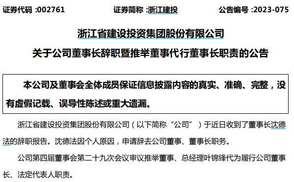 中新经纬注意到,浙江建投10月18日曾公告称,沈德法因个人原因,申请辞去公司董事、董事长职务。公司第四届董事会第二十九次会议审议推举董事、总经理叶锦锋代为履行公司董事长、法定代表人职责。