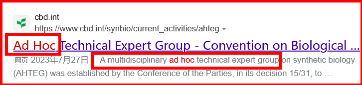 据笔者观察,在CBD公约等机制中,一般来说,“ad hoc”是依据某个决议或者决定的要求建立的,是有临时性和特定目的,指的是为了解决某个问题或任务而创建的组织或委员会。因此不奇怪,一般不具Voting Member的投票权、选举权、决策权。