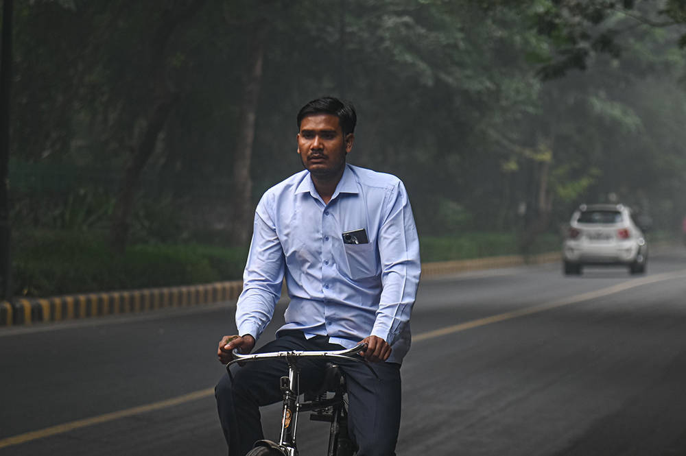 当地时间2023年11月4日,印度新德里,一名男子在雾霾和污染中骑车出行。