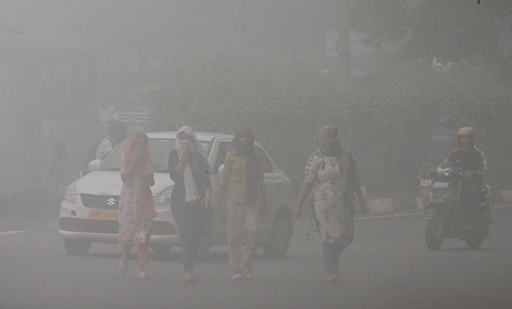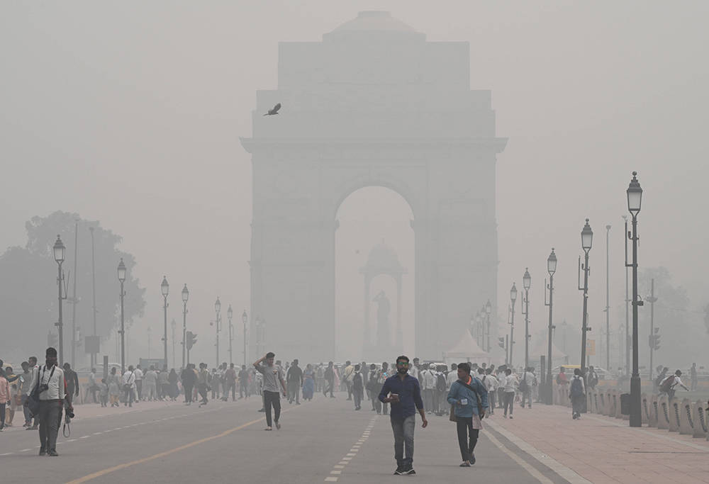 当地时间2023年11月4日,印度新德里,人们戴着口罩走在雾霾浓重的路上。