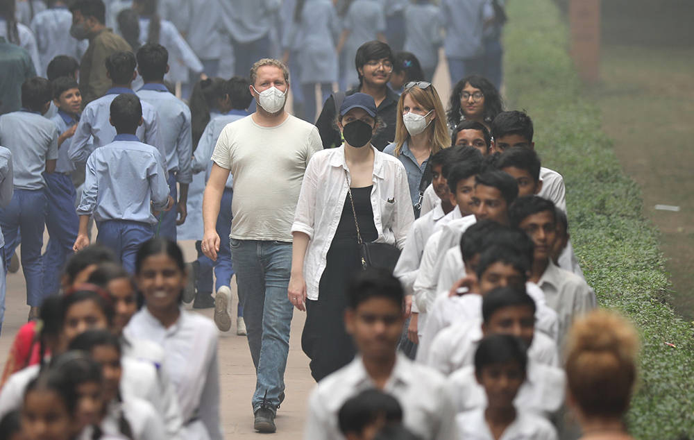 当地时间2023年11月4日,印度新德里,学生和游客在严重的雾霾中参观印度门。