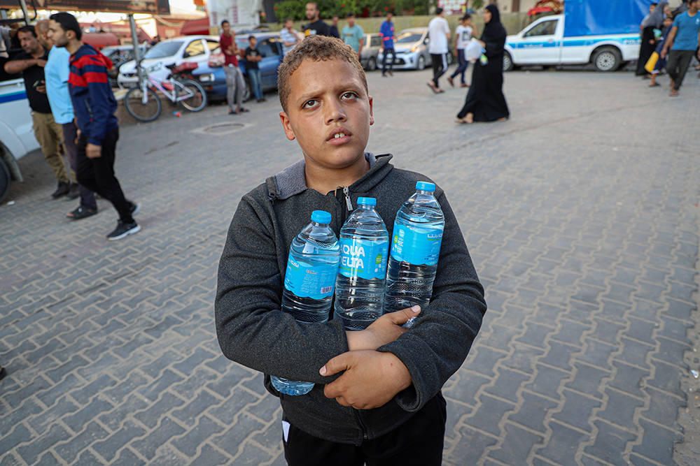 当地时间2023年11月4日,加沙汗尤尼斯,一名儿童抱着自己分到的水。