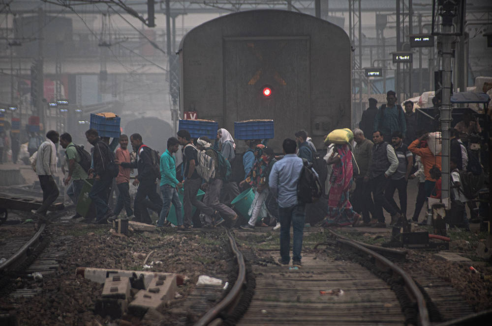 当地时间2023年11月4日,印度新德里,通勤者在浓雾中行走。