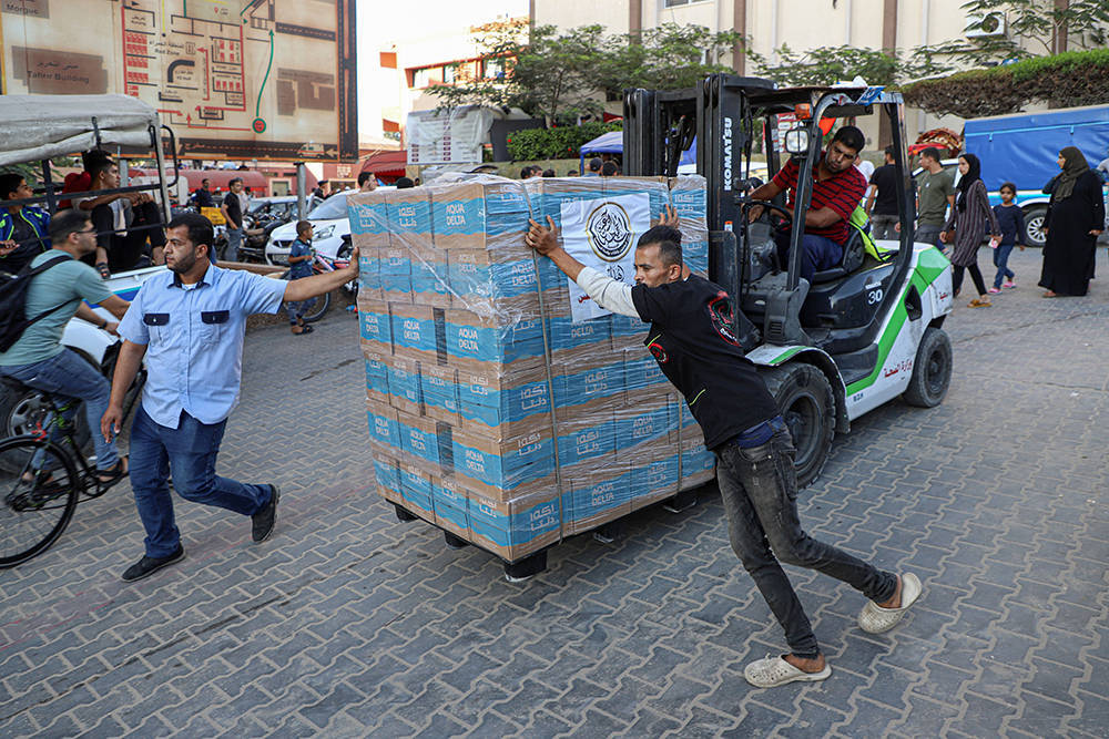 当地时间2023年11月4日,加沙汗尤尼斯,工人搬运救援物资。