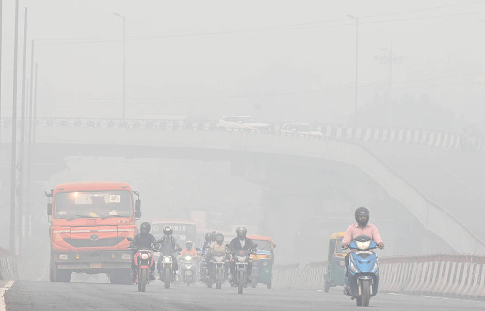 当地时间2023年11月4日,印度新德里,高速公路上的车辆行驶在严重的雾霾和污染中。