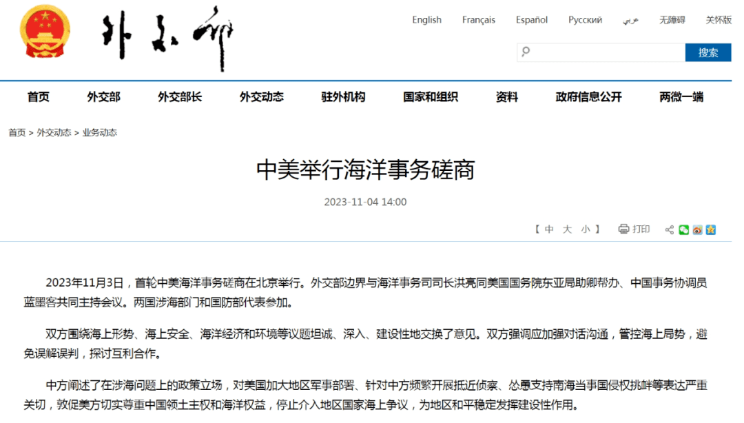 据外交部网站消息,11月3日,首轮中美海洋事务磋商在北京举行。外交部边界与海洋事务司司长洪亮同美国国务院东亚局助卿帮办、中国事务协调员蓝墨客共同主持会议。两国涉海部门和国防部代表参加。