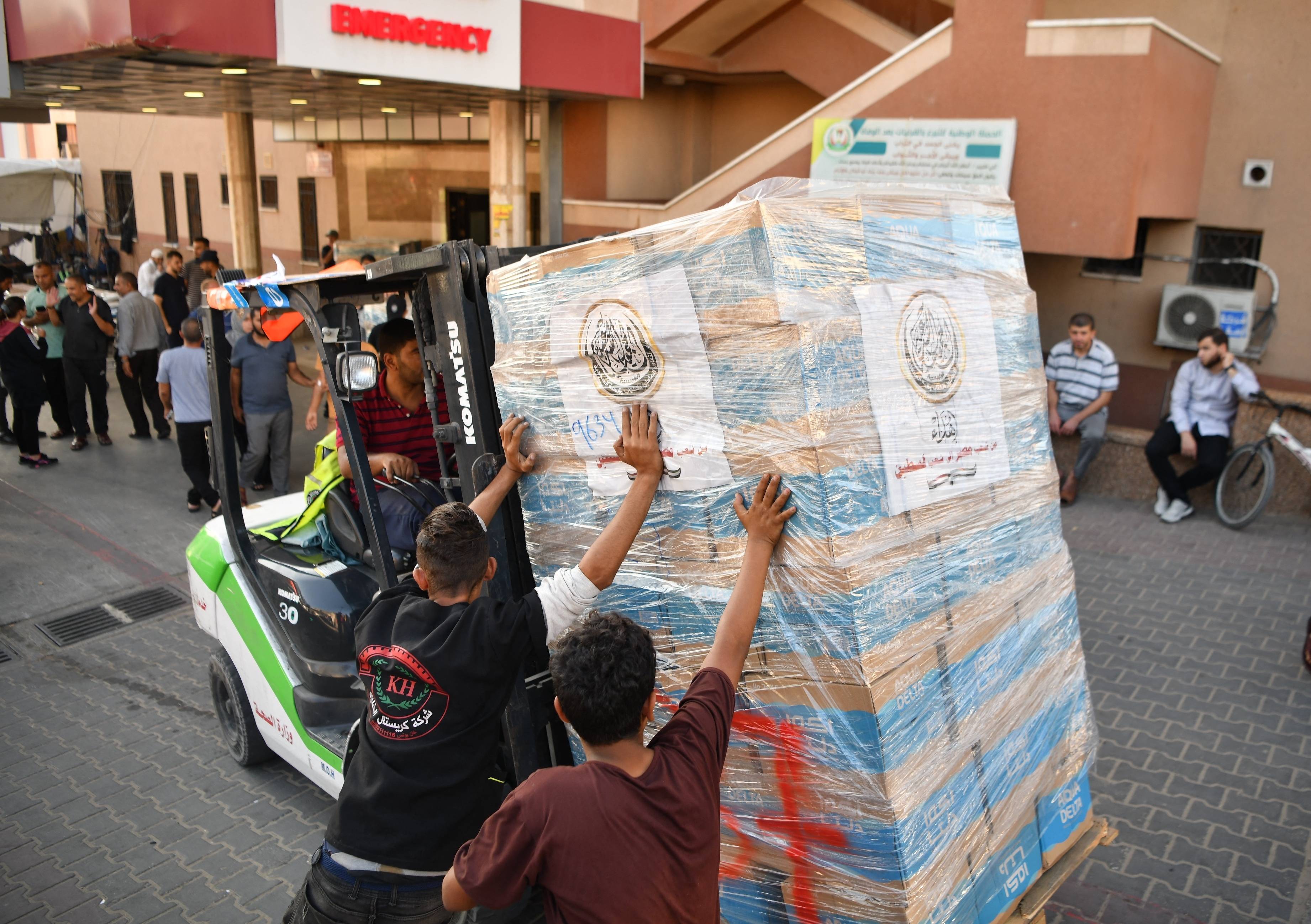 当地时间2023年11月4日,加沙汗尤尼斯,巴以冲突持续,加沙供水系统崩溃,来自埃及的饮用水援助物资抵达纳赛尔医院。