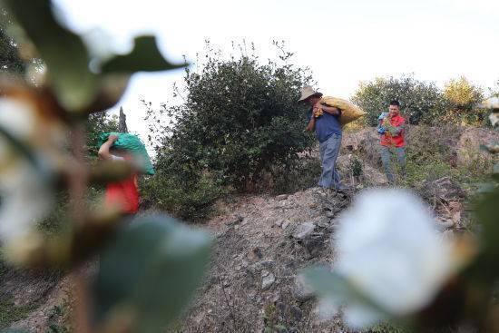 图为抚州市公路事业发展中心广昌分中心驻枫岭村工作队和志愿者们正在帮助农户把采收的油茶扛运下山,确保雨季来临前茶籽采收完成。