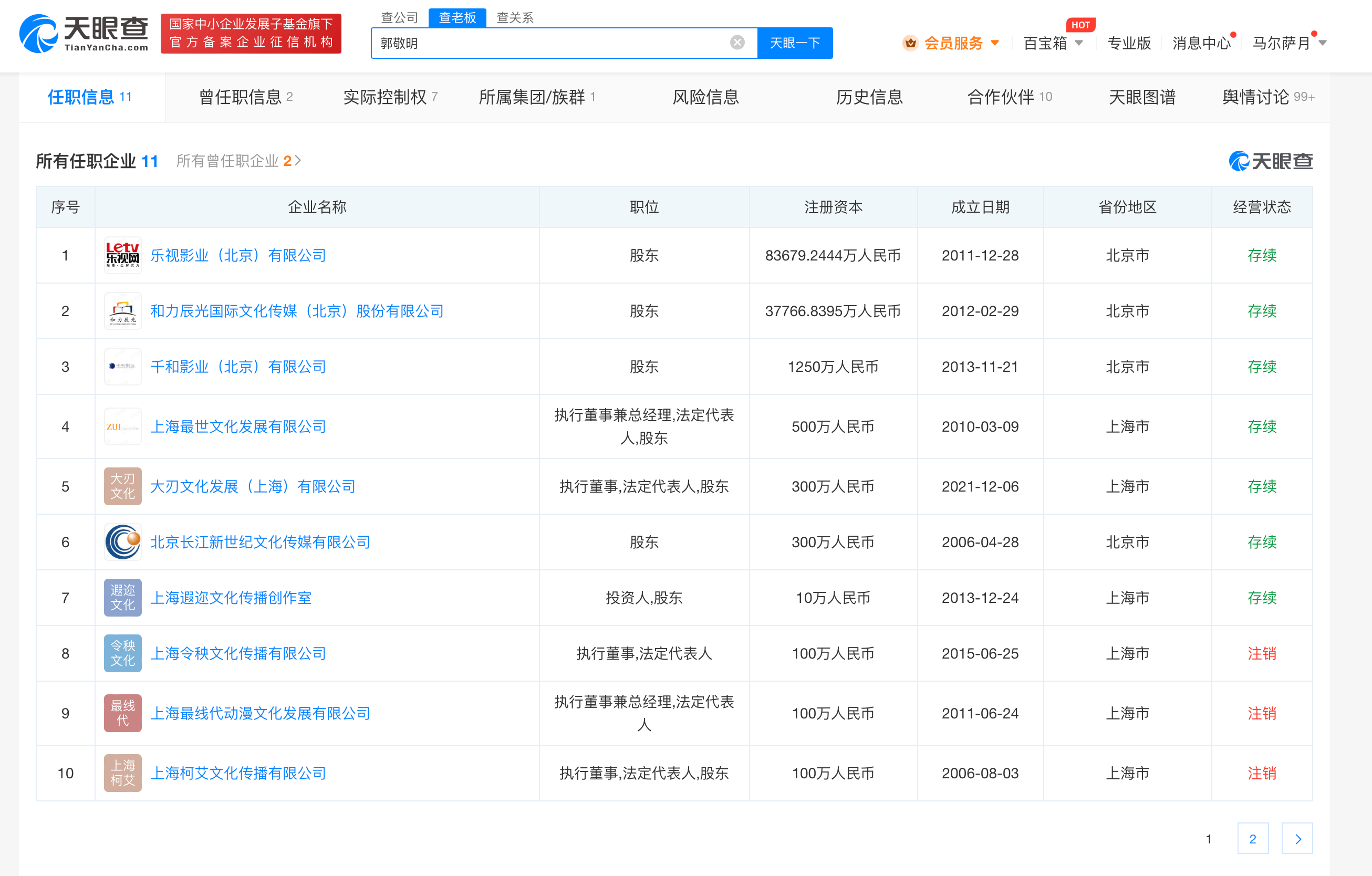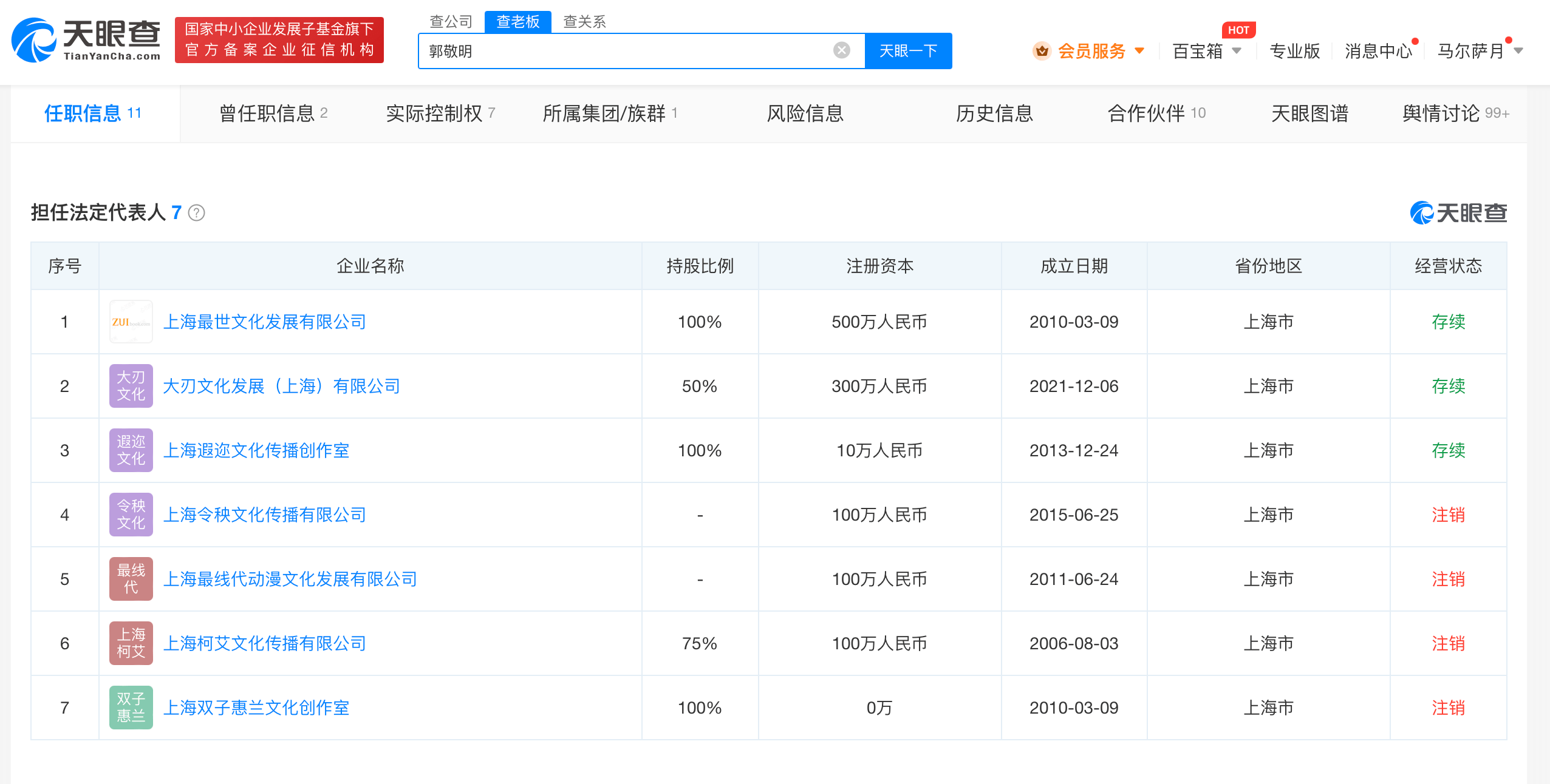 天眼查App显示,郭敬明关联的11家企业中7家为存续状态,包括上海最世文化发展有限公司、乐视影业(北京)有限公司、千和影业(北京)有限公司等。郭敬明在7家企业均持有股份,并担任上海最世文化发展有限公司、上海遐迩文化传播创作室、大刃文化发展(上海)有限公司3家企业法定代表人、执行董事等。