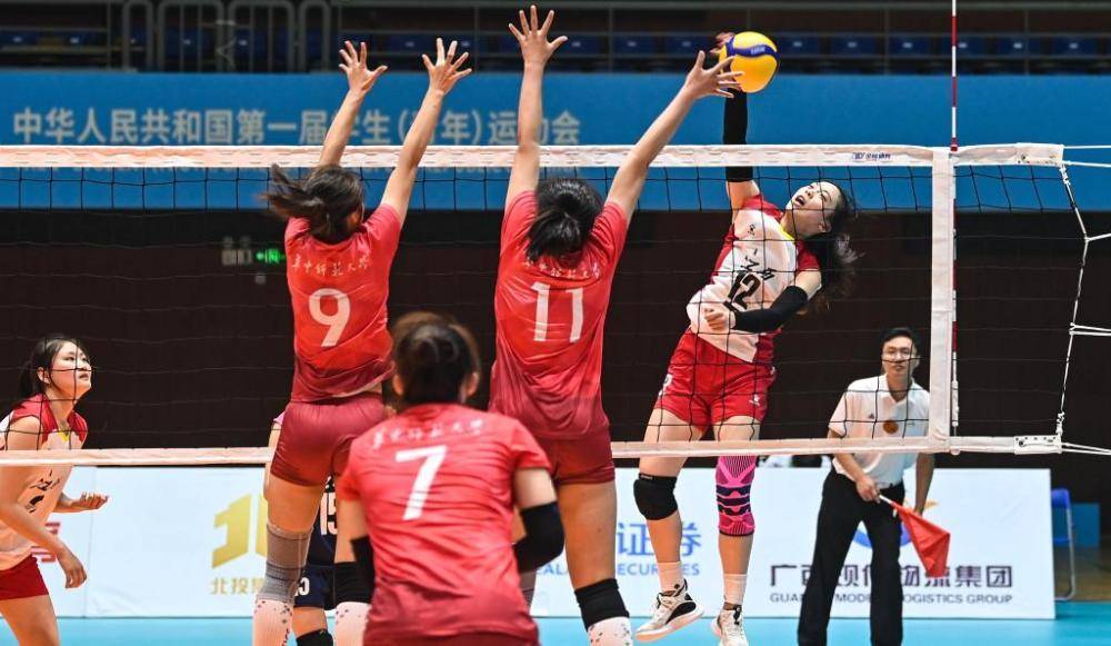 10月31日,第一届全国学生(青年)运动会(校园组)排球大学女子组小组赛第三轮比赛在广西钦州举行。新华社记者 张爱林 摄