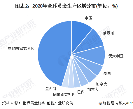 从黄金产量区域分布来看,中国是世界最大的黄金生产国,产量占全球总量的近11%,其次为俄罗斯、澳大利亚和美国。