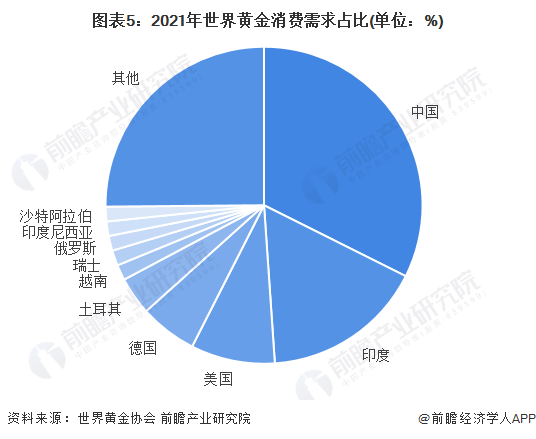 2021年全球黄金消费量为4021吨。从区域需求来看,中国是全球最大的黄金消费国,占全球黄金消费比重的30%以上。其次是印度、美国和德国,分别占比17%、9%和6%。