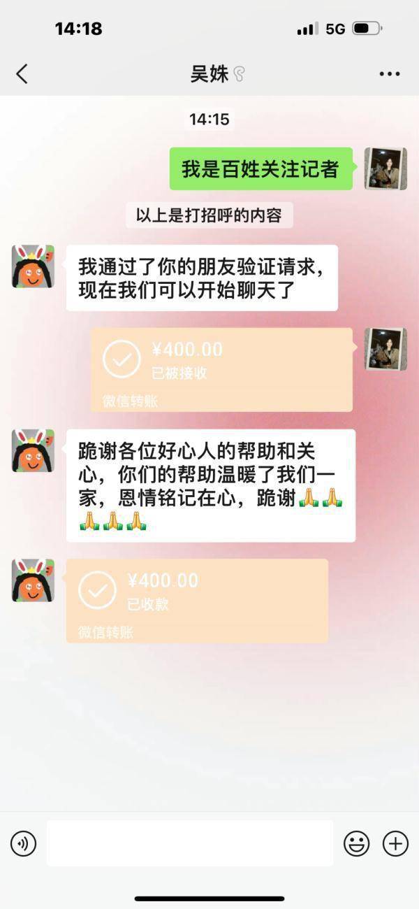 在现场,记者也将一位爱心人士捐款通过微信转给了吴姝。