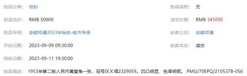 在前段时间举办的安徽邓通拍卖会中,就有一张拍出了34.5万,它就是黄1角纸币!