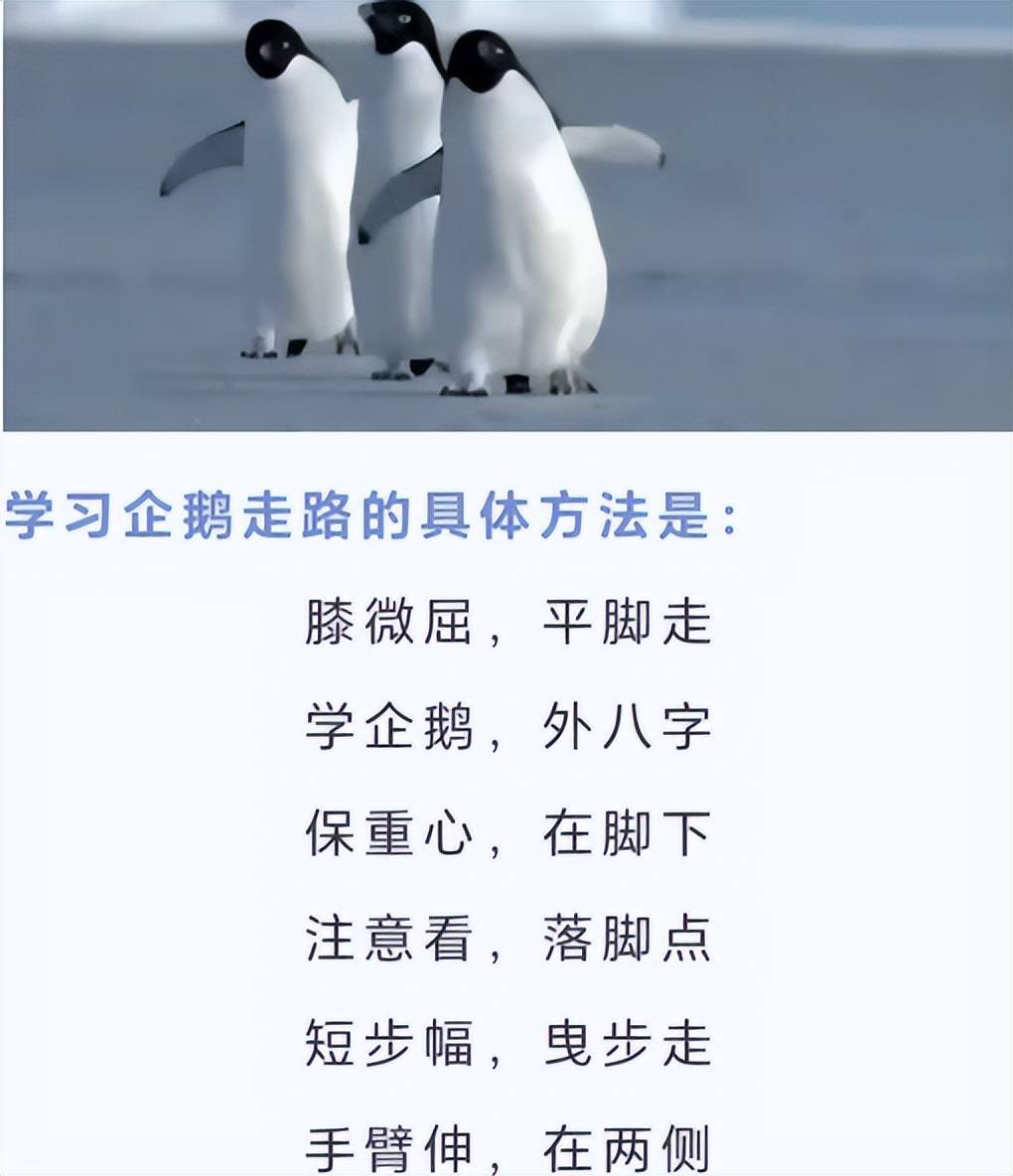 这个不是开玩笑,人家还附上插图和具体的文字,指导学生们像企鹅那样行走。谁能想到“邯郸学步”有朝一日我们会学这呀?