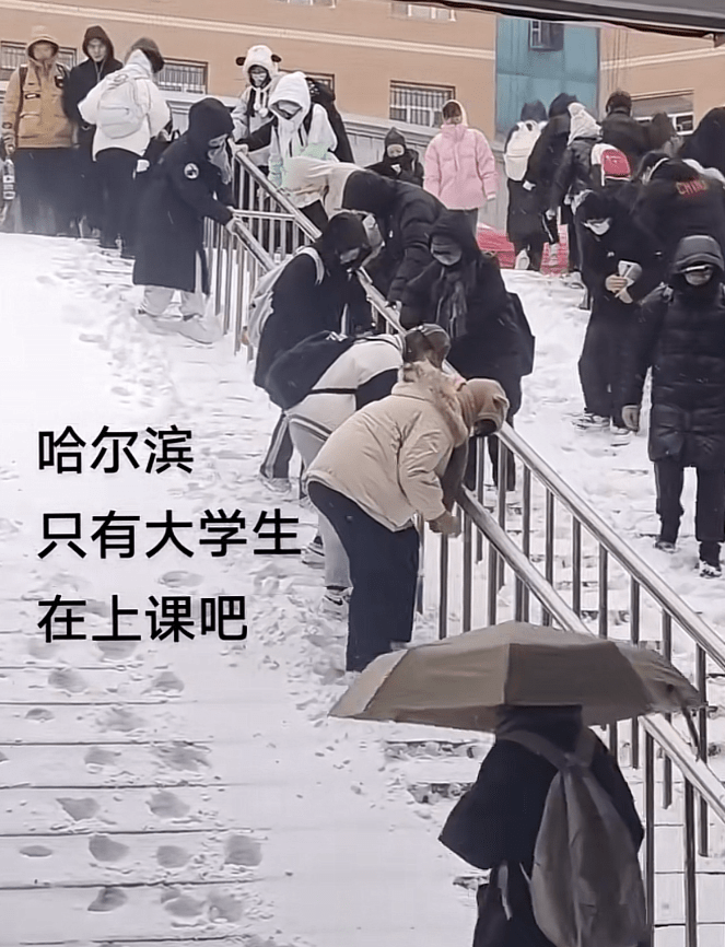 有同学拍下了大学生上学途中的场面,真是另一种诙谐之感。题主的“灵魂拷问”说出不少人的心声:这种大雪天,哈尔滨估计只有大学生在上学吧?
