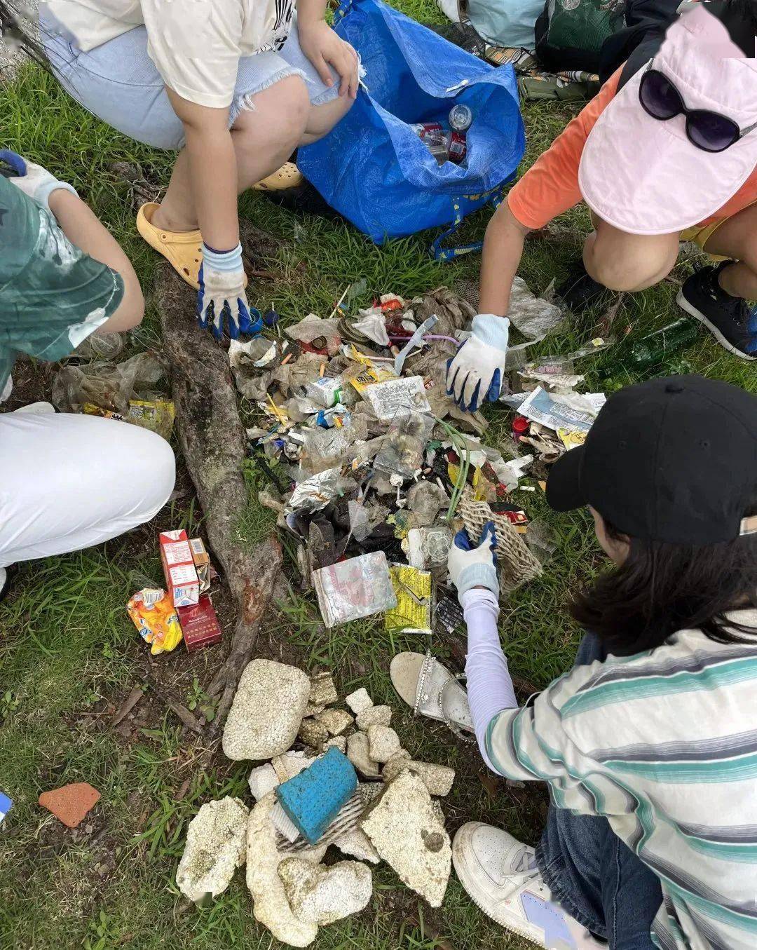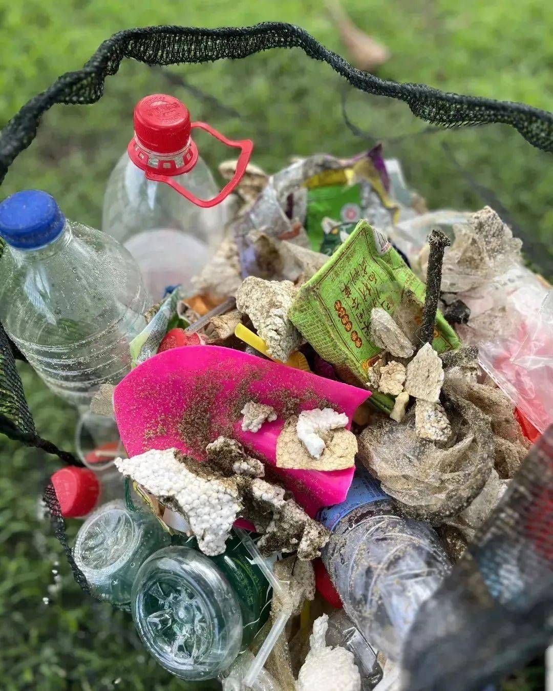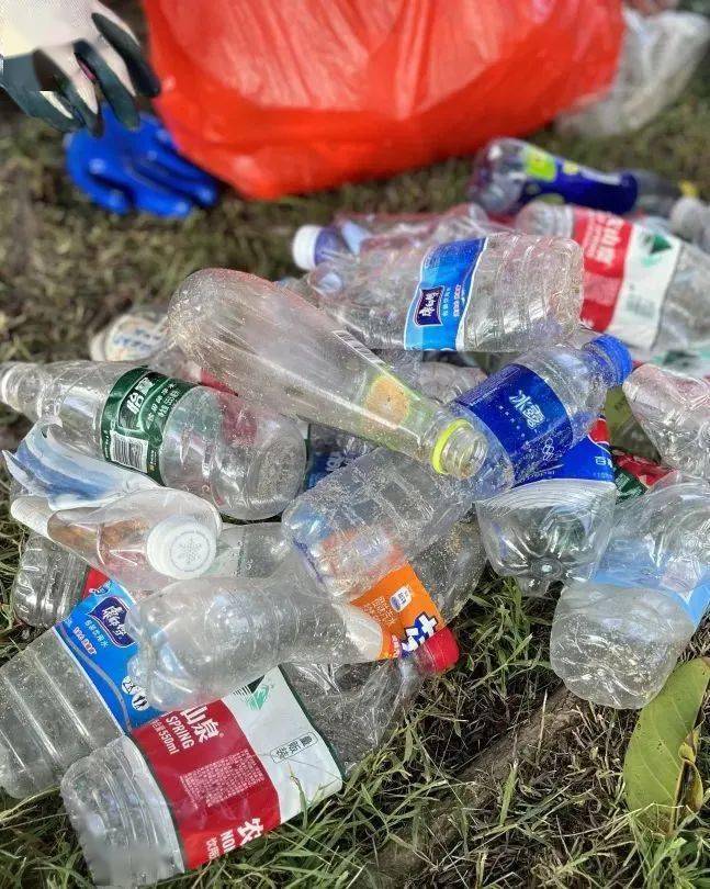 在好料菌带薪捡垃圾的那个下午,不到二十分钟就能捡满一麻袋,有矿泉水瓶、纸巾、泡沫甚至旧衣旧鞋,其中最常见的就是难以自然降解的塑料垃圾。