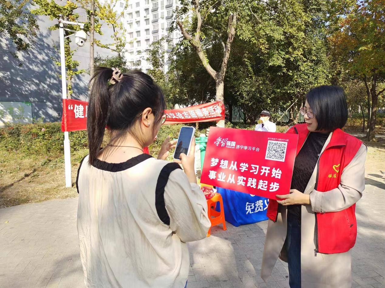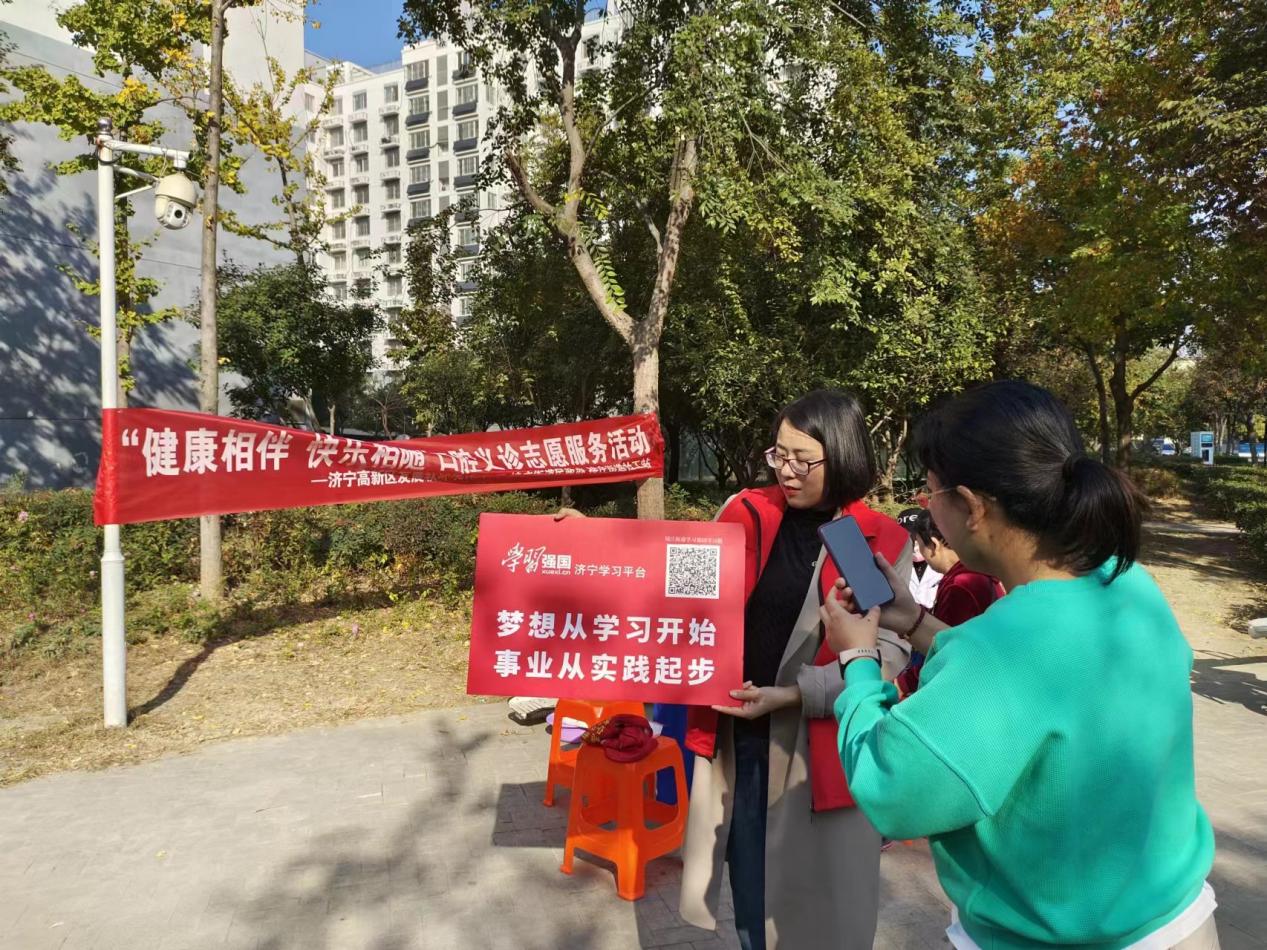 11月1日,济宁高新区接庄街道开展“学习强国”平台线下推广活动走进义诊现场,进一步扩大“学习强国”平台的使用人数,带动更多人参与到学习中来。