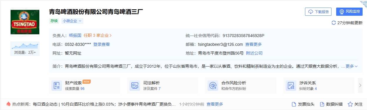 天眼查App显示,11月3日,青岛啤酒股份有限公司青岛啤酒三厂发生工商变更,负责人由刘德利变更为杨振国。青岛啤酒三厂成立于2012年2月,系青岛啤酒股份有限公司分支机构,经营范围为啤酒(熟啤酒、鲜啤酒、特种啤酒)制造。