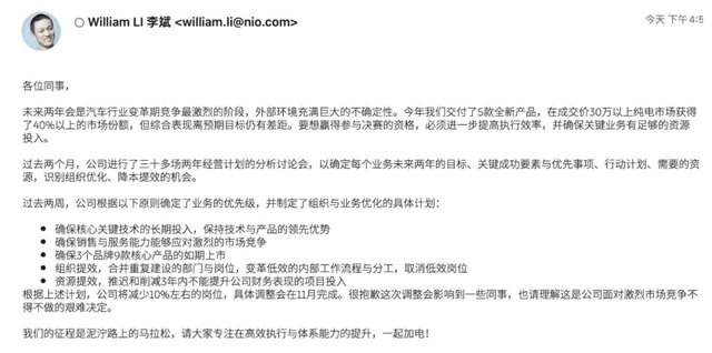 【导语:11月3日,蔚来汽车创始人、董事长兼CEO李斌发布全员信表示,该公司将减少10%左右的岗位,相关调整会在11月份完成。蔚来为什么裁员,下一步何去何从?】