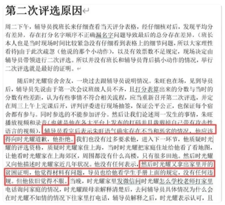 从他发布的文章能看出,这个学校每学期评选贫困生是采用全班投票打分的形式。在学生们打分之后,朱同学的排名是班级第五名,他的室友排在第四名。