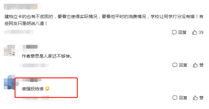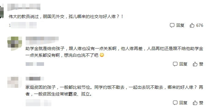 但是也有网友表示的:“伟大的教员说过,弱国无外交,孤儿哪来的社交与好人缘。”还有网友表示,在他们学校,建档立户的贫困生是必须要助学金的,不用选举也不用查人品,只要相关证明的真实性就行。