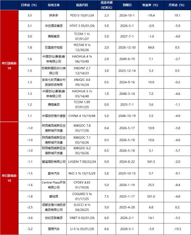 11月3日,12只地产债成交价格偏离幅度超10%。其中,“20宝龙04”跌超18%,“H0阳城04”跌80%;“20金地MTN004”涨超13%,“21金地MTN002”涨超14%,“21金地MTN003”涨超16%,“21金地03”“21金地04”“16金地02”涨超17%,“21金地MTN007”涨超21%,“21远洋控股PPN001”涨超22%,“21金地MTN001”涨超41%,“H0融创03”涨超50%。