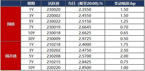 11月3日,股市偏强压制债市情绪,银行间主要利率债收益率普遍上行。截至北京时间20:00,10年期国债活跃券230018收益率上行0.65bps至2.6625%;10年期国开债活跃券220220收益率上行1.00bps至2.8500%。