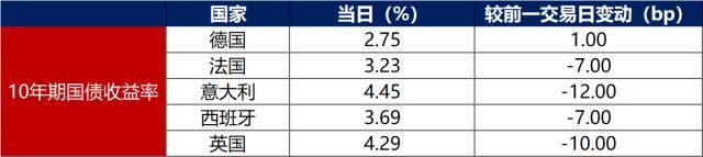 11月3日,除德国10年期国债收益率小幅上行1bp至2.75%外,主要欧洲经济体10年期国债收益率普遍下行。法国、意大利、西班牙、英国10年期国债收益率分别下行7bp、12bp、7bp和10bp。