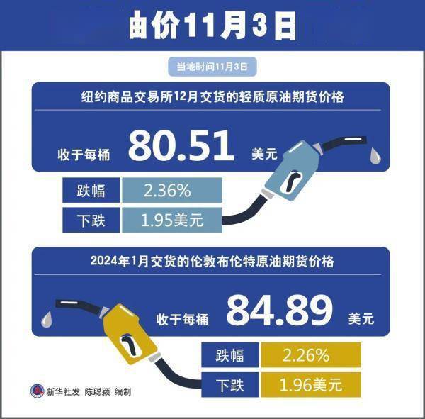 截至11月3日当天收盘,纽约商品交易所12月交货的轻质原油期货价格下跌1.95美元,收于每桶80.51美元,跌幅为2.36%;2024年1月交货的伦敦布伦特原油期货价格下跌1.96美元,收于每桶84.89美元,跌幅为2.26%。