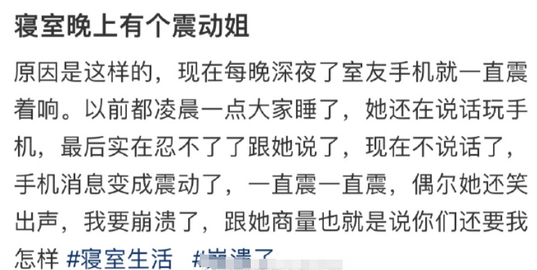 就像有一位女大学生在网络上偷偷吐槽,说自己的寝室晚上有一个震动姐。每天深夜甚至是凌晨1点,大家都已经陷入到沉沉的睡眠了,突然寝室里就传来一阵震动。