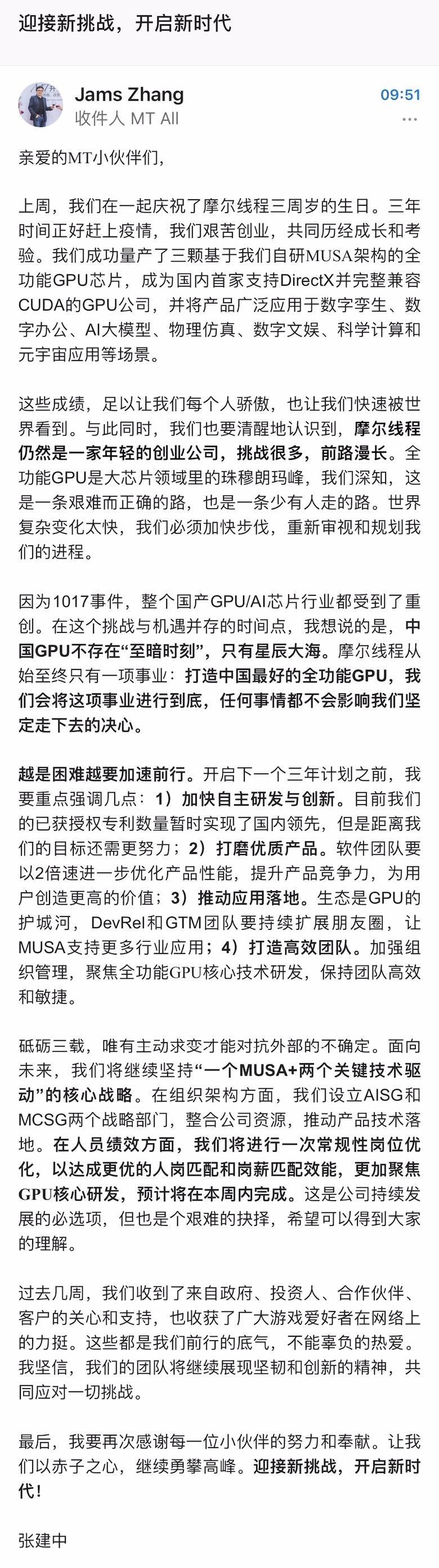 “因为1017事件,整个国产GPU/AI芯片行业都受到了重创。在这个挑战与机遇并存的时间点,我想说的是,中国GPU不存在‘至暗时刻’,只有星辰大海。摩尔线程从始至终只有一项事业:打造中国最好的全功能GPU,我们会将这项事业进行到底,任何事情都不会影响我们坚定走下去的决心。”张建中在内部信中介绍这次人员优化的大背景。