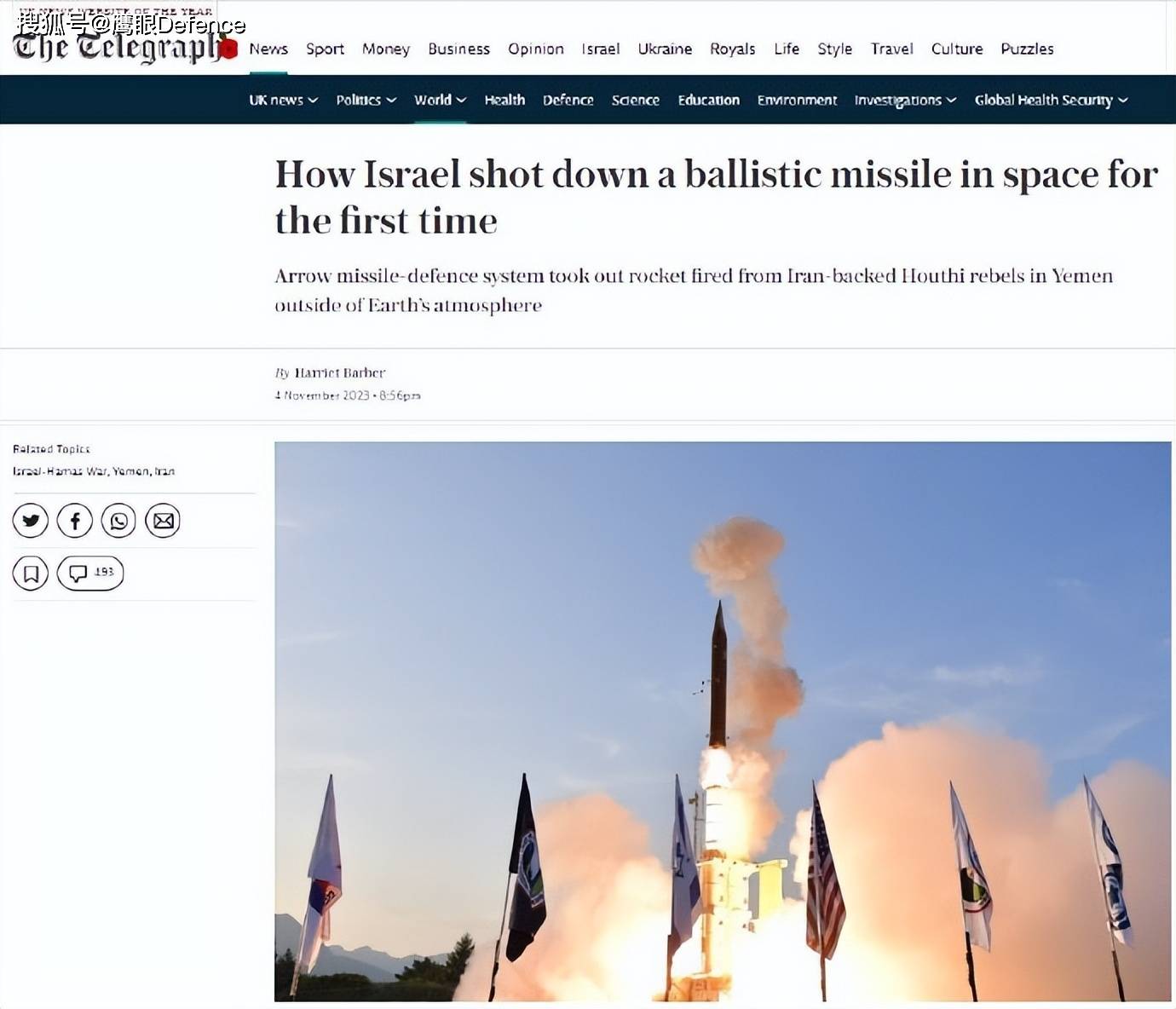包括《每日电讯报》在内,多家媒体报道称,以色列空军使用“箭”反导系统在大气层外拦截了胡塞武装发射的1枚弹道导弹,这枚导弹从也门发射,目标是以色列沿海城市埃拉特,在飞行了近1600公里后在太空中被拦截,以色列国防军放出了相关拦截视频,可以在互联网上看到。