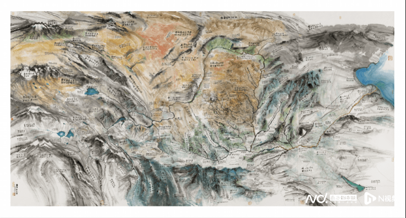 位于展厅左侧的,是北京特邀艺术家邱志杰创作的《黄河诗境图》,其参照了真实的黄河地理及黄河流域地貌,将山川湖海,以及黄河全域再现于画面之上。同时,作品将历史上关于黄河的古代诗篇分布在相应的所描写的地点之上,置于图中。全图标注了二百多句历代诗词:昆仑山上可见李白的“黄河西来决昆仑,咆哮万里触龙门”;腾格里沙漠中有王唯的“大漠孤烟直,长河落日圆”;贺兰山脚下是岳飞的:“驾长车,踏破贺兰山缺”;以及小孩子们都耳熟能详的北朝民歌“天苍苍,野茫茫。风吹草低见牛羊”等等来自历朝历代、脍炙人口的千古名句。使观者于画作之中感山湖壮阔,随黄河之水观诗路流淌。