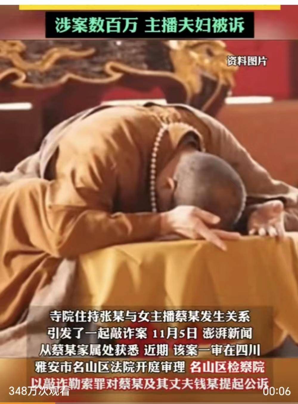 最近,四川省发生了一起令人震惊的事件。据报道,一名寺庙主持张某因贪图女主播的美色,与她发生了性关系。这一行为被女主播的丈夫钱某发现,并通过秘拍设备拍摄了两人在酒店房间内的关系视频。为了解决此事,张某支付了200万元赔偿并与蔡某一同回到福建。然而,两年后,钱某却以网络曝光为要挟,索要330万元。张某不得不分期付款,但后来因担心被继续敲诈而报警,钱某和蔡某也被捕。