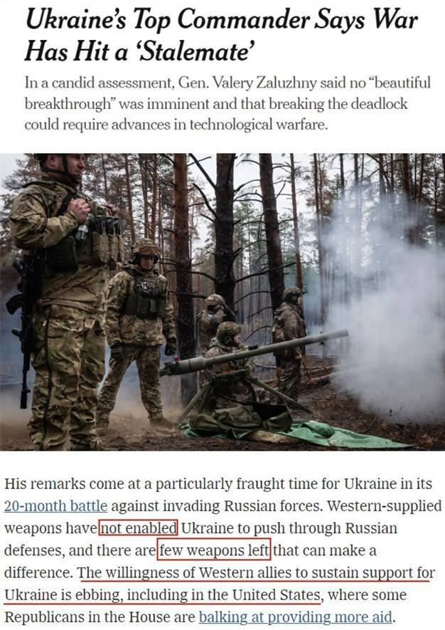 《纽约时报》报道称,截至目前的事实表明,美西方提供的武器不足以令乌军取得突破,而且“能够帮助扭转局势”的武器已所剩无几。