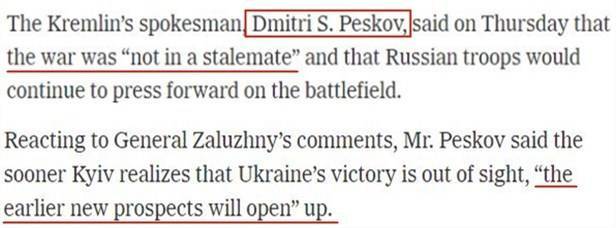 对于扎卢日内有关当前战事已陷入僵局的说法,俄罗斯总统新闻秘书佩斯科夫反驳称,俄罗斯并未陷入僵局,并将继续推进特别军事行动,所有既定目标都必须要实现。