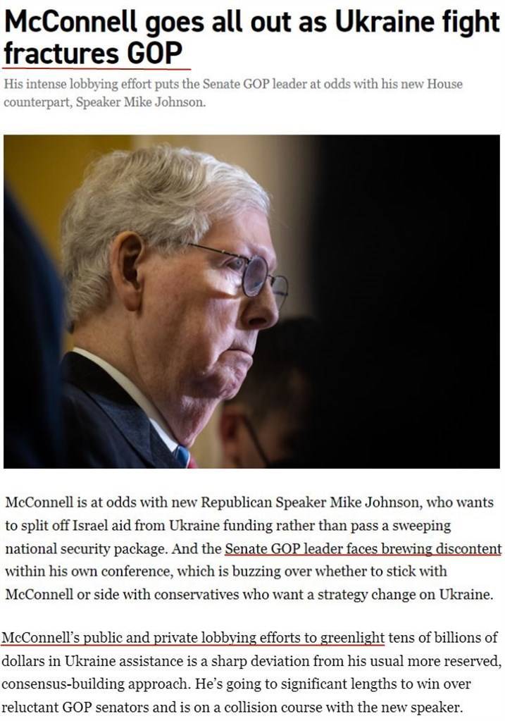 据报道,为了在明年大选之前给自己留下“重要政治遗产”,一向力挺乌克兰的参议院少数党(共和党)领袖麦康奈尔正在游说本党同僚,争取让他们为数百亿美元援乌资金开绿灯。