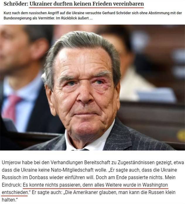德国前总理施罗德日前在接受《柏林日报》采访时也证实,在伊斯坦布尔和谈中,乌克兰人不接受和平是因为美国不允许,否则俄乌冲突“本可于2022年结束”。